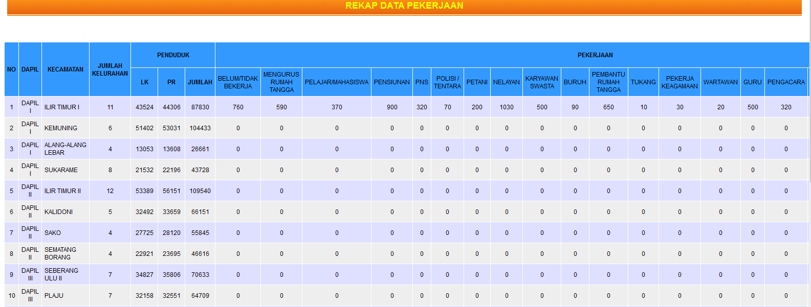 - untuk memudahkan analisa data, data bisa ditampilkan dalam bentuk grafik per wilayah atau grafik per pekerjaan, asal suku, dan data lainnya sesuai dengan keinginan.